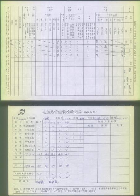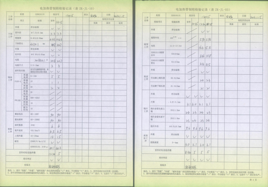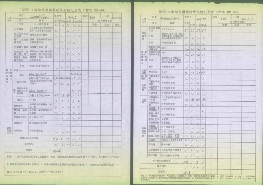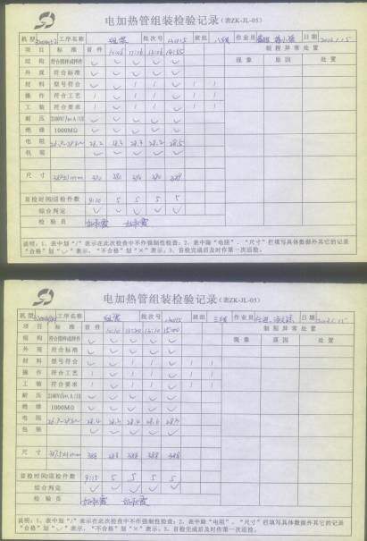電熱管車(chē)間首件、制程巡檢、末件表
